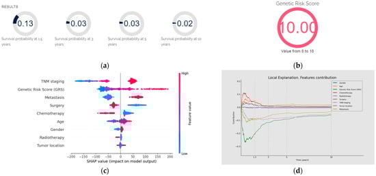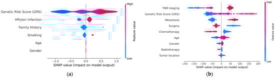 Global explainability: (a) diagnosis; (b) prognosis. (a) indicates that genetics, H. pylori infection, family history of GC, and smoking are the factors that globally influenced the model’s decision the most in this example. High GRS values and having a family history of GC are associated with an increased risk of GC. Conversely, low GRS values or not being infected by H. pylori act as protective factors. (b) indicates that TNM stage and genetics are the factors that most significantly influenced the model’s decision globally, while tumour location had the least influence. Advanced TNM stages, high values of the GRS, having metastasis at the time of diagnosis, not undergoing surgery, and not receiving chemotherapy are factors with a negative impact on survival (less favourable prognosis).