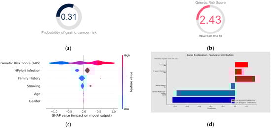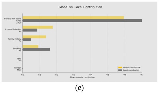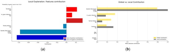 (a) Local explainability; (b) local vs. global explainability. (a) illustrates the local explainability graph of an individual who, despite been infected by H. pylori and being a smoker, is at low risk of GC due to lacking a family history of the disease and having a low GRS (2.7 out of 10). Additionally, (b) represents both the local and global explainability of the model. The mean absolute contribution of each variable to the model’s prediction is presented. This graph allows for the comparison of variable importance on a global level and in individual predictions. In this example, the GRS presents a more significant contribution compared to its contribution in the global model, acting as a protective factor.