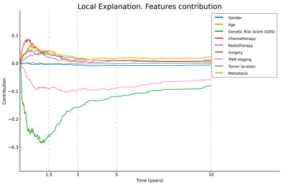 Local explainability of prognosis. This figure illustrates the local explainability graph for a 40-year-old male patient with distal GC and an advanced TNM stage IV. In addition, this individual underwent chemotherapy, radiotherapy, and surgery after his diagnosis. His GRS value is 10 (maximum value). The graph depicts the contribution of each variable over time. Negative contributions indicate a higher risk (less favourable prognosis), while positive contributions indicate the opposite. The graph shows that, despite the patient presenting only two characteristics that have a negative influence on overall survival, these factors have a significant impact, reaching the highest levels.