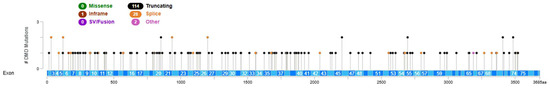 Currently, 145 different pathogenic and likely pathogenic variants reported by multiple submitters in patients with DMD have been listed in the ClinVar Registry (July 2024) (Figure 1). As shown in Figure 1, variants are distributed across the entire gene. According to different studies reported in the literature, variant localization may reflect some specific cardiovascular characteristics such as the onset of DCM related to pathogenic variants in DMD exons 12 and 14–17 or the presence of heart diseases in patients carrying variants in exons 31–42 [30]. Furthermore, a decrease in cardiac risk has been reported to be associated with variants located in exons 51 or 52 [30]. These data indicate that specific DMD variants can lead to cardioprotective or DCM-causing effects in DMD/BMD patients according to the specific location of the genetic alteration [30].