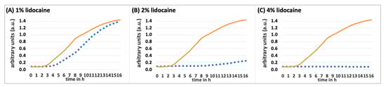 A 1% lidocaine concentration extends the lag phase by 2 h; however, as shown earlier in Figure 1, the pathogens eventually recover, reaching similar densities to the growth control after 16 h. With 2% lidocaine, the extension of the lag phase is notably, increasing by 6 h and for 4%; one does not observe growth within 16 h compared to the growth control.