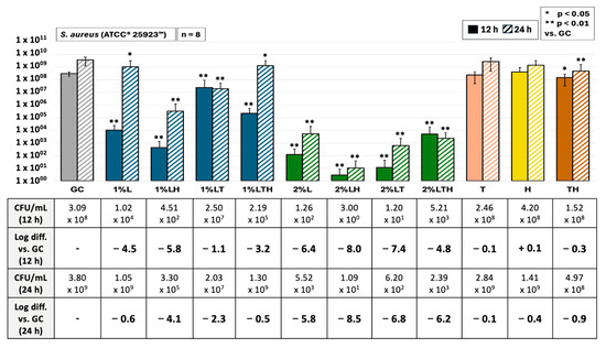 Antimicrobial efficacy of 1% and 2% lidocaine containing test solutions against S. aureus over 12 and 24 h. Lidocaine solutions were tested solely (L) or in combination with hyaluronan (LH) or Triam40 (LT) or with both substances (LTH). All test groups referred to unaltered bacterial growth culture under the same conditions (media, volume, temperature, and time of incubation). Moreover, further control groups at same bacterial concentrations were tested without lidocaine in the presence of the mentioned therapeutic additives for joint injections (Triam40, hyaluronan, and both: T, H, TH).