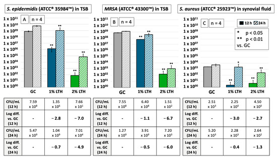 Antimicrobial effects of 1%/2% lidocaine formulations on S. epidermidis (A) and MRSA (B) in TSB and on S. aureus in synovial fluid (C). This figure demonstrates the significant antimicrobial effects of 1% and 2% lidocaine, combined with Triam40 and hyaluronan (LTH), against S. epidermidis (filled bars) and against MRSA (checkered bar) in TSB, as well as against S. aureus (lined bar) in synovial fluid. These effects are compared to the growth control at an initial bacterial density of 300 CFU/mL over 12 and 24 h. Notably, the 1% lidocaine formulation shows no significant effectiveness after 24 h in synovial fluid.