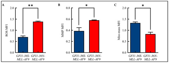 Alterations in mitochondrial metabolism. Increased (A): reactive oxygen species (ROS) and (B): mitochondrial membrane potential (MMP) with (C): decreased mitochondrial mass (mito-mass) in GFI1-36N-MLL-AF9 cells. Mean ± SEM; * p ≤ 0.05; ** p ≤ 0.01; n = 3.