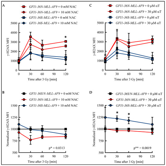 In both leukemic GFI1-36S and GFI1-36N cells, the maximum number of DSBs was detected 30 min after irradiation. While in GFI1-36S leukemic cells the γ-H2AX MFI decreased at subsequent time points, it remained at a constant high level in GFI1-36N leukemic cells (Figure 3A,C). The γ-H2AX level was higher in the untreated GFI1-36N cells with a maximum MFI of 3548 ± 492 than in the untreated GFI1-36S cells with a maximum of 1811 ± 627 (Figure 3A,C). The γ-H2AX MFI of NAC-treated GFI1-36N cells was also increased compared to that of treated GFI1-36S cells (Figure 3A). Strikingly, 10 mM NAC was only able to reduce γ-H2AX MFI in the leukemic GFI1-36N cells, whereas GFI1-36S cells were not affected by NAC treatment. Consequently, the γ-H2AX MFI normalized to untreated cells was significantly lower in GFI1-36N cells than in GFI1-36S cells (Figure 3B). A similar pattern was seen regarding the number of GFI1-36N-γ-H2AX+ cells that could be reduced by NAC (Figure S3A,B). The leukemic GFI1-36S cells treated with 30 μM αT had a higher γ-H2AX intensity than the untreated GFI1-36S cells at all time points (Figure 3C). The treated GFI1-36N cells exhibited slightly decreased γ-H2AX intensity compared to the untreated GFI1-36N cells (Figure 3C). After normalization of the γ-H2AX MFI of treated GFI1-36S and GFI1-36N cells to the untreated control, GFI1-36N leukemic cells were found to have a significantly lower γ-H2AX level (Figure 3D). However, it should be noted that the significant difference in γ-H2AX MFI between GFI1-36S-MLL-AF9 and GFI1-36N-MLL-AF9 cells was only due to the slightly increased MFI in GFI1-36S cells. Accordingly, αT did not have as pronounced an effect on the reduction of GFI1-36N-γ-H2AX+ cells as NAC (Figure S3C,D).