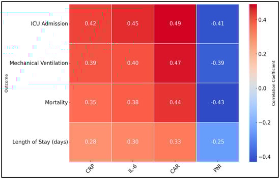 Significant positive correlations were observed between inflammatory markers (CRP, IL-6) and both ICU admission and mechanical ventilation, underscoring the role of systemic inflammation in driving severe respiratory failure and critical care needs. CAR, integrating CRP and albumin, displayed even stronger correlations with ICU admission (r = 0.49) and mechanical ventilation (r = 0.47), emphasizing its predictive strength for severe complications. Interestingly, mortality also correlated positively with CRP, IL-6, and CAR, suggesting that heightened inflammatory states may predispose patients to fatal outcomes. Conversely, PNI consistently showed negative correlations with adverse outcomes, including ICU admission (r = −0.41), mechanical ventilation (r = −0.39), mortality (r = −0.43), and length of stay (r = −0.25). This indicates that better nutritional and immunological reserves (higher PNI) may protect against progression to critical illness and death. Additionally, length of stay was positively correlated with all inflammatory markers and negatively correlated with PNI, implying that heightened inflammation and poor nutritional status may prolong hospitalization (Table 3 and Figure 1).