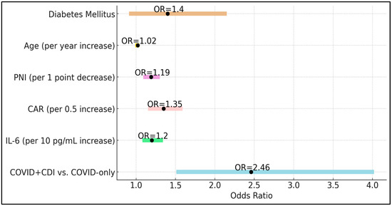 The presence of CDI emerged as a strong independent risk factor (OR 2.46, 95% CI 1.51–4.02, p < 0.001), emphasizing that beyond pre-existing conditions, co-infection with CDI significantly worsens the clinical trajectory of COVID-19. Elevations in IL-6 increased the odds of severe outcomes by 20% for each 10 pg/mL increment (OR 1.20, p = 0.001), underscoring the pathogenic role of uncontrolled cytokine release. Similarly, each 0.5-unit increase in CAR raised the odds of severe outcomes by 35% (OR 1.35, p < 0.001), and each unit decrease in PNI increased the odds by 19% (OR 1.19, p < 0.001), highlighting the intertwined importance of inflammatory burden and nutritional status. Interestingly, age and diabetes mellitus, while clinically relevant comorbid factors, did not reach statistical significance as independent predictors in this model (p = 0.20 and p = 0.12, respectively). This finding suggests that, within a population already hospitalized for COVID-19, the dynamic interplay of acute inflammatory markers and the presence of CDI may overshadow these baseline factors (Table 5 and Figure 2).