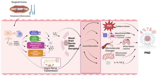 - Jia, S.; Yang, H.; Huang, F.; Fan, W. Systemic inflammation, neuroinflammation and perioperative neurocognitive disorders. Inflamm. Res. 2023, 72, 1895–1907. [Google Scholar] [CrossRef] [PubMed]
