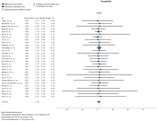 Meta-analysis forest plot [6,9,12,13,14,15,16,17,18,19,20,21,22,23,24,25,26,27,28,29,30,31,32,33,34,35,36,37,38].