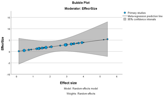 The bubble plot in Figure 3, using effect size as a moderator, visually represents the relationship between effect sizes across primary studies included in the meta-regression. The plot shows a positive slope in the regression line, indicating a potential increase in effect size across studies. When larger effect sizes occur, there is considerable variability in these estimates.