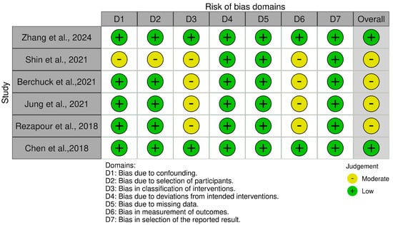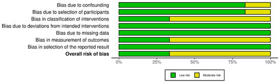 In this systematic review, a comprehensive risk of bias assessment was conducted for all included studies to ensure the validity and reliability of the findings. A total of 29 studies were evaluated using appropriate risk of bias tools based on study design. Specifically, the Risk of Bias in Non-randomized Studies of Interventions (ROBINS-I) tool was applied to six cohort studies. The ROBINS-I tool evaluates risk of bias across seven domains: confounding factors, selection of participants, classification of interventions, deviations from intended interventions, missing data, measurement of outcomes, and selection of the reported result, providing a comprehensive assessment of potential biases in non-randomized studies.