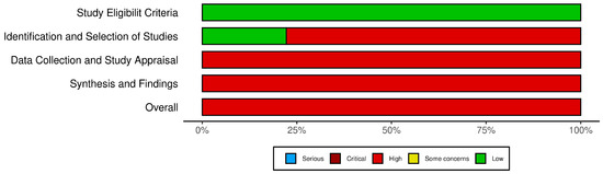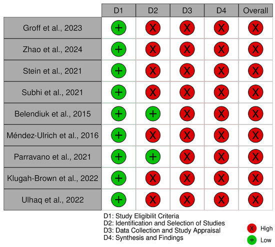 In the evaluation using the Newcastle–Ottawa Scale (NOS) (Figure 8), the cross-sectional and case–control studies were assessed across domains related to selection, comparability, and outcome assessment. The traffic light plot that represents the overall risk of bias for each study is showed in Figure 9.