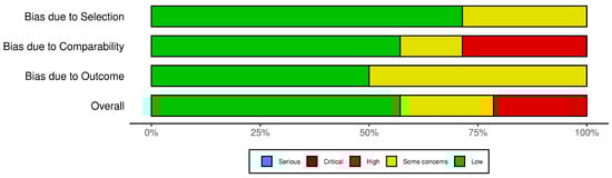 Regarding the risk of bias, the results indicated that most studies had a low risk of bias in selection and comparability. Nonetheless, moderate to high risks were noted for some studies due to limitations in outcome ascertainment and exposure assessment. Specifically, the absence of detailed non-response information and inconsistencies in control group definitions contributed to these elevated risks.