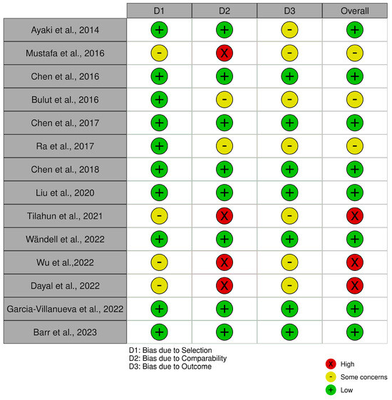 For the remaining 14 cross-sectional and case–control studies, the Newcastle–Ottawa Scale (NOS) was employed. This scale evaluates risk of bias across three broad categories: selection (representativeness of cases/controls, selection of controls, and exposure ascertainment), comparability (controlling for key confounders), and outcome/exposure assessment. Each category is rated to determine overall study quality and potential sources of bias.