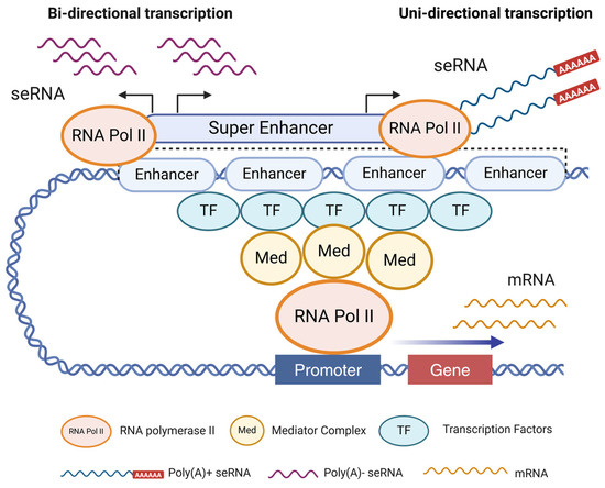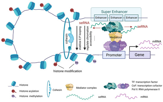 The generation of seRNAs involves a series of intricate molecular processes. Initially, the SE region undergoes chromatin opening, which exposes the DNA motifs to an active conformation. This conformation enables the recruitment of RNA polymerase II and other specific TFs to bind to particular gene regions, initiating the transcription of non-coding RNA [72] (Figure 2). Simultaneously, chromatin remodeling and histone modifications play pivotal roles in creating an environment conducive for transcription [73]. Regulatory factors that influence seRNA production include intracellular signaling pathways, environmental cues, and epigenetic modifications. For example, activation of certain cytokines can promote seRNA synthesis, whereas alterations in DNA methylation can suppress their expression.