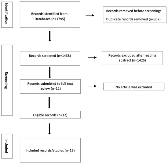 In total, 1795 articles were retrieved via different databases and 1438 were assessed after duplicate exclusion. The initial assessment of titles and abstracts was performed by two independent reviewers, T.K. and D.M. Subsequently, a full-text assessment was performed. If a study was selected only by one reviewer, the decision was taken by a third reviewer (N.M.). Ultimately, twelve records were selected for full text assessment and included in this literature review. Figure 1 presents the study selection process. A formal risk of bias and a quality assessment were not performed due to the narrative nature of this review.