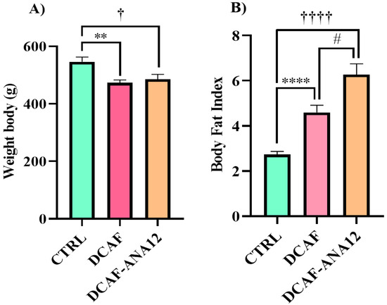 Effect of chronic consumption of cafeteria-style diet on (A) body weight and (B) body fat index in male rats. TrkB receptor antagonism enhanced the increase in body fat. CTRL, control group with standard diet; DCAF, cafeteria-style diet group; DCAF-ANA12, cafeteria-style diet group and ANA-12 drug treatment. The groups were compared with one-way ANOVA and Tukey’s test for post hoc analysis. Differences between groups were significant at p < 0.05. Symbols asterisk (CTRL vs. DCAF, ** p < 0.01; **** p < 0.0001), dagger (CTRL vs. DCAF-ANA12, † p < 0.05; †††† p < 0.0001), hashtag (DCAF vs. DCAF-ANA12, # p < 0.05).