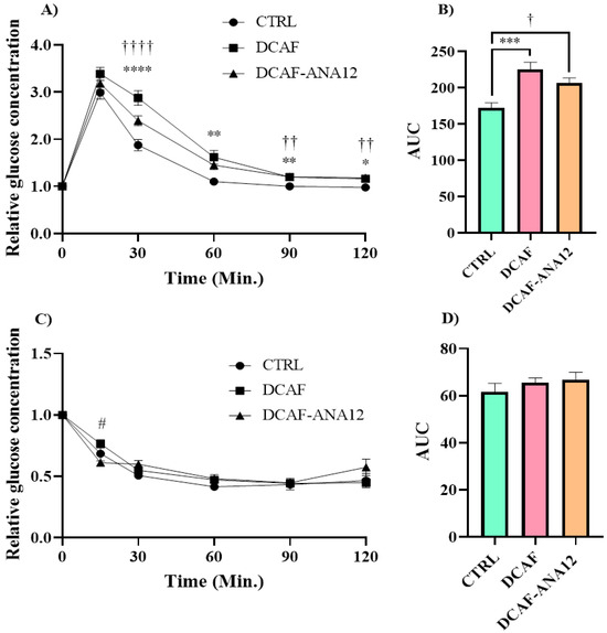 Fasting blood glucose values were not significantly modified by the cafeteria-style diet (CTRL group, 100 ± 2 mg/dL; DCAF group, 99 ± 2 mg/dL; DCAF-ANA12 group, 96 ± 1 mg/dL). The analysis of the tolerance curves showed that the cafeteria-style diet induced a dysregulation in glucose tolerance, and the AUC of the DCAF group was significantly higher than that of the CTRL group (225 ± 10 vs. 172 ± 7). The same effect was observed in the DCAF-ANA12 group with respect to the CTRL group (AUC, 206 ± 7 vs. 172 ± 7) (Figure 2).