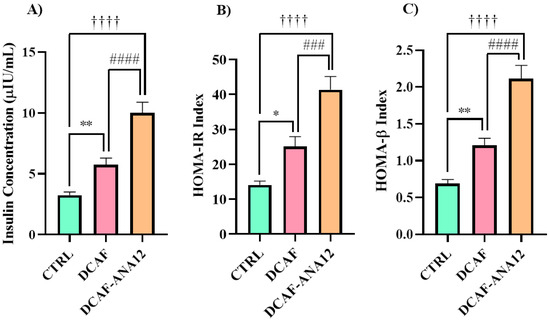 Serum insulin levels (A) and HOMA indices (B,C) of rats fed a cafeteria-style diet and treated with ANA-12 to antagonize the trkB receptor. CTRL, control group with standard diet; DCAF, cafeteria-style diet group; DCAF-ANA12, cafeteria-style diet group and ANA-12 drug treatment. The groups were compared with one-way ANOVA and Tukey’s test for post hoc analysis. Differences between groups were significant to p < 0.05. Symbols asterisk (CTRL vs. DCAF, * p < 0.05; ** p < 0.01), dagger (CTRL vs. DCAF-ANA12, †††† p < 0.0001), hashtag (DCAF vs. DCAF-ANA12, ### p < 0.001; #### p < 0.0001).