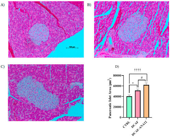 Illustrative images of pancreatic islets stained with hematoxylin-eosin. (A) CTRL, control group with standard diet; (B) DCAF, cafeteria-style diet group; (C) DCAF-ANA12, cafeteria-style diet group and ANA-12 drug treatment; (D) Comparative analysis of islet size. The groups were compared with one-way ANOVA and Tukey’s test for post hoc analysis. Differences between groups were significant to p < 0.05. Symbols asterisk (CTRL vs. DCAF, * p < 0.05), dagger (CTRL vs. DCAF-ANA12, †††† p < 0.0001), hashtag (DCAF vs. DCAF-ANA12, # p < 0.05). Images (B,C) have the same scale as shown in (A).