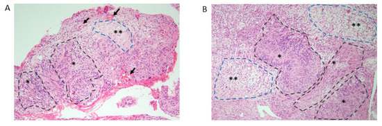 Histology of the cervical nerve tumors in CMT–FSGS patient 2 with INF2 p.V108D variant. Histology of surgically removed cervical mass at the age of 29 years revealed a biphasic pattern with mixed hypercellular (Antoni A, asterisk) and hypocellular (Antoni B, double asterisk) areas. Antoni A areas show a variably cellular lesion composed of spindle cells with focal nuclear palisading. Antoni B areas show a loose reticular or myxoid pattern, probably reflecting the degeneration form of the Antoni A area. Vascularization can be observed in the subcapsular areas (arrows). Cells composing the tumor do not show any mitotic activity or necrosis. (A) Lower magnification ×40, (B) higher magnification ×100. Hematoxylin and eosin stain.