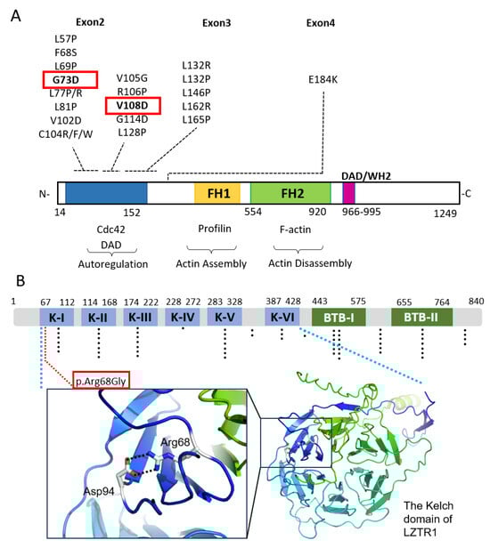 Locations of mutations of INF2 and LZTR1 in our CMT–FSGS cases. (A) The domain structure of INF2 and locations of variants. The DID domain, formin homology domains (FH1, FH2), and the DAD domain are shown. The genetic variants previously reported in dual CMT–FSGS phenotype are shown above the domain structure. The variants of our present cases are boxed. The function of the distinctive domains and interacting partners are shown below the domain diagram. Amino acids are numbered according to NM_022489.4. Domains are defined by the NCBI Conserved Domains search base upon NP_071934.3. DAD: C-terminal diaphanous autoregulatory domain; DID: diaphanous inhibitory domain, FH1: formin homology 1; FH2: formin homology 2. (B) The domain structure of LZTR1 and locations Arg68Gly of variants. K-I~K-VI, Kelch motifs of the Kelch domain; BTB-I and BTB-II; BACK-I and BACK-II (partial BACK) domains. cDNA and amino acid positions according to NM_006767.4 and NP_006758.2. The positions of mutations previously identified in the schwannomatosis/glioblastoma are plotted with dots. There are no obvious cluster of mutations [23]. The location of p.Arg68Gly is highlighted with a red box. The Arg68 residue forms an ion pair with Asp94 in the β propeller of the first Kelch repeat domain, which forms the binding pockets for the substrates like RIT1. The structure of LZTR1 was predicted by AlphaFold3.
