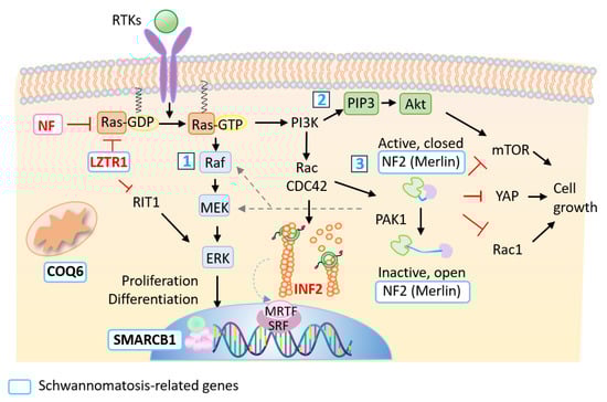 Regulatory pathways controlling cell proliferation and differentiation. The figure illustrates the signaling flow and crosstalk, together with positive (black arrows), dotted line or negative (red) control for the cascades. Classically, two tumor suppressors, NF1 and NF2, have been implicated in the peripheral nerve sheath tumors. NF1 (neurofibromin) converts active Ras (GTP-bound) to inactive Ras (GDP-bound). Activated GTP-Ras increases cell growth by evoking mitogen-activated protein kinase (MAPK) signaling (also known as the Ras–Raf–MEK–ERK pathway, box 1) as well as PI3K–AKT–mTOR signaling (box 2) [38,39,40,41]. These signal pathways mediate a wide variety of cellular functions, including cell proliferation, survival, and differentiation. NF2 (Merlin), box 3, is implicated as a negative regulator of Rac1, mTOR, and Hippo/YAP signaling, as well as the MAPK signaling pathway, the activation of all increases cell growth [42]. Recent genetic studies have shown that mutations in LZTR1, SMARCB1, and COQ6 cause schwannomatosis. Loss of LZTR1 functions decrease the ubiquitination of Ras, thereby overactivating MAPK signaling. Dysregulation of the Ras–MARK signaling pathway presents clinically as a set of disorders of RASopathy (NF1, Noonan syndrome, etc.) [43]. A Ras GTPase, RIT1, has emerged as a driver of human diseases, i.e., Noonan syndrome and cancer. The mechanism is ascribed to the inability of RIT1 variants to interact with LZTR1, which hampers the protein degradation of RIT1 [44,45]. INF2 elongates and severs the linear F-actin filaments. INF2 also controls gene transcription by facilitating the nuclear transition of MRTF and activating the transcription of serum response factor (SRF) target genes, which encode structural and regulatory effectors of actin dynamics [46]. Abbreviations: PI3K, phosphatidylinositol 3-kinase; RTK, receptor tyrosine kinase; YAP, yes-associated protein; mTOR, mammalian target of rapamycin; PAK1, p21-activated kinase 1; LZTR1, leucine-zipper-like transcriptional regulator 1; RIT1, GTP-binding protein Rit1; SRF, serum response factor, MRTF, myocardin-related transcription factors.