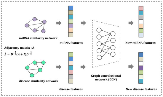Here, we systemically illustrate the design of an algorithm that can learn low-dimensional node representations while preserving the network topologies and neighboring structures of the nodes [49]. A GCN is a machine learning-based, semi-supervised learning method that is widely used to capture node feature vectors in graph-structured data. The GCN efficiently captures hidden layer representations while conserving both the node features and local graph structure. As shown in Figure 1, two inputs are required to implement the GCN: adjacency matrix A∈ and feature matrix F∈, where a represents the number of nodes present in adjacency matrix A and f represents the feature dimensions. The feature matrix F was extracted from the vector information of each miRNA row and disease column in the miRNA–disease association matrix. is an edge-weighted similarity miRNA or disease network. Given a miRNA, we stack multiple layers to implement the GCN, which is expressed as follows (Equation (9)):