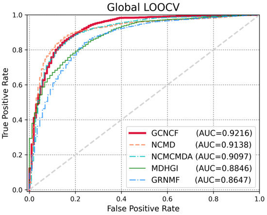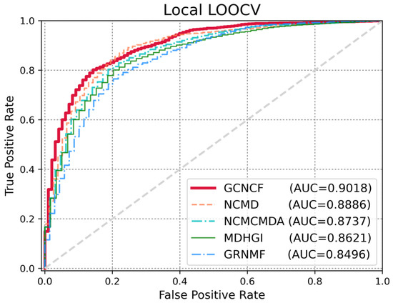 To accurately measure the performance of GCNCF, we conducted a comparative experiment with the latest studies, namely, NCMD [17], NCMCMDA [36], MDHGI [35], and GRNMF [30]. Based on the global LOOCV (Figure 3), GCNCF achieved a meaningful AUC score of 0.9216, which was superior to those of NCMD (0.9138), NCMCMDA (0.9097), MDHGI (0.8846), and GRNMF (0.8647). We used local LOOCV to demonstrate the performance of GCNCF in identifying novel disease-related miRNAs. As shown in Figure 4, the GCNCF obtained an AUC score of 0.9018, indicating that it performed better than NCMD (0.8886) and NCMCMDA (0. 8737), MDHGI (0.8621), and GRNMF (0.8496). Moreover, the performance of the model was measured quantitatively using AUPR, ACC, and MCC. As summarized in Table 3 and Table 4, we proved that GCNCF performed better based on various statistical values.