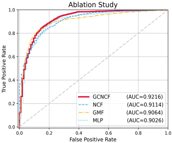 The most straightforward way to accurately evaluate each machine-learning model component is to implement an ablation study. An ablation study is an experiment in which the components of a machine learning model are removed to assess the effect of the removed components on model performance. In this study, we propose a hybrid model that combines the GMF and MLP to ascertain the benefits of linearity and nonlinearity. To evaluate the performance of the GMF and MLP components, we removed the corresponding components from the model and evaluated their performances. The GMF model excludes the MLP module from the proposed GCNCF model, whereas the MLP model excludes the GMF module from the GCNCF model. One of the main contributions of this study is the proposed method of effectively capturing high-dimensional structural information from the input graph using graph convolutional networks (GCNs). This is particularly useful for modeling complex relationships between entities, especially in graph-based data, where interactions can be more accurately represented. To validate this approach, we conducted experiments comparing the performance of the model with and without the use of GCN. In our framework, GCN serves solely as a feature extractor and does not function as an independent predictor or classifier. In other words, GCN’s role is limited to extracting informative feature vectors from the input graph, which are then fed into the neural collaborative filtering (NCF) model for prediction. Therefore, using GCN alone does not yield meaningful predictive results, and we define the model without GCN as the ’NCF model’. The experimental results show that when GCN is used to extract feature vectors, the performance of the model significantly outperforms the NCF model that does not utilize GCN. This demonstrates that GCN is highly effective at extracting high-quality feature representations from the graph, which plays a crucial role in improving the predictive performance of the model. The results confirm that GCN is not only effective in processing graph data but also essential for optimizing model performance by providing rich feature vectors that enhance the overall accuracy of predictions. As illustrated in Figure 5, the model with the GMF, MLP, and GCN components (GCNCF) performed better than when each component was used alone.