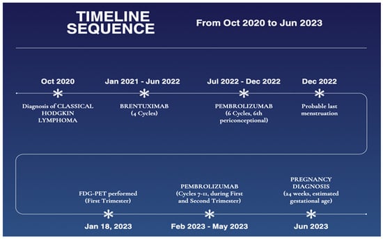 A multiparous patient, diagnosed with Hodgkin’s lymphoma (HL), nodular sclerosis subtype, in October 2020, was already undergoing treatment for type 1 diabetes with Insulin Lispro and Glargine. She underwent chemotherapy treatment according to the ABVD protocol (Doxorubicin, Bleomycin, Vinblastine, and Dacarbazine) from November 2020 to April 2021, with biweekly infusion cycles. Due to persistent disease after this regimen, second-line therapy with Dexamethasone, Cisplatin, and Cytarabine was initiated. The patient refused to undergo an autologous transplant. Subsequently, given disease progression, she underwent chemotherapy with Brentuximab and Bendamustine, followed by Brentuximab Vedotin (four cycles between January 2021 and June 2022). However, due to limited clinical response, treatment with pembrolizumab was started (11 cycles between September 2022 and May 2023). Following a positive pregnancy test performed due to prolonged amenorrhea, the patient was referred to our maternal–fetal medicine center. The last menstrual period was unknown, and an ultrasound dating the pregnancy performed on 6 June 2023, revealed a gestational age of approximately 24 weeks, estimating the last menstrual period (LMP) to be 20 December 2022. After determining the start of the gestational period, we reconstructed the treatments and diagnostic tests performed during the pregnancy (Figure 1):