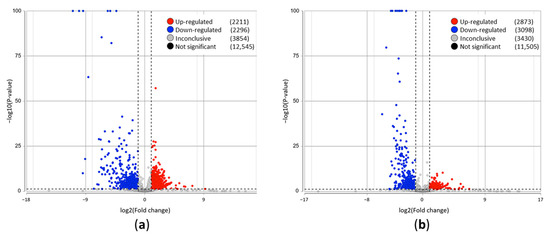 Overview of the gene expression profile in Acinetobacter baumannii (A. baumannii) infection-associated pulmonary host response. (a) Volcano plot of differential gene expression patterns of the bronchoalveolar lavage fluid (BALF) sample from the A. baumannii with NDM-infected lung versus the BALF sample from the lung without bacterial infection. The significantly dysregulated genes in the BALF sample from the A. baumannii-infected lung (those with −log10 [p-value] > 1.3; fold change > 2) are shown in blue (downregulation) and red (upregulation). (b) Volcano plot of differential gene expression patterns of the BALF sample from the A. baumannii-infected lung versus the BALF sample from the lung without bacterial infection. The significantly dysregulated genes in the BALF sample from the lung with A. baumannii without resistant gene infection (those with −log10 [p-value] > 1.3; fold change > 2) are shown in blue (downregulation) and red (upregulation).