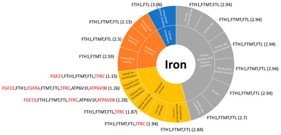 Here, we used k-means clustering to divide these 57 genes into the following 3 clusters: red, related to the regulation of the actin cytoskeleton and EPH–Ephrin signaling; blue, related to the antigen processing and presentation of exogenous peptide antigens; and green, related to ferroptosis and iron uptake. Regarding ferroptosis and iron uptake, the STRING provided the pathways and functions that may be influenced, with the iron-related parts being shown in Figure 4. The pathway-related genes are listed next to the respective pathway, with red indicating increased expression and black indicating decreased expression.
