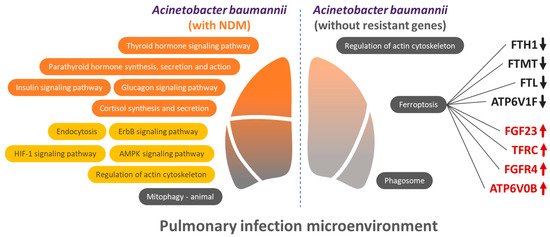 In this study, we found that pulmonary host responses to pneumonia caused by A. baumannii with the NDM resistance gene involved significantly more prominent immune responses. On the other hand, host responses to pneumonia caused by A. baumannii lacking antimicrobial resistance genes were more closely associated with iron-related pathways. These findings may be beneficial for the development of future treatments for pneumonia (Figure 5).