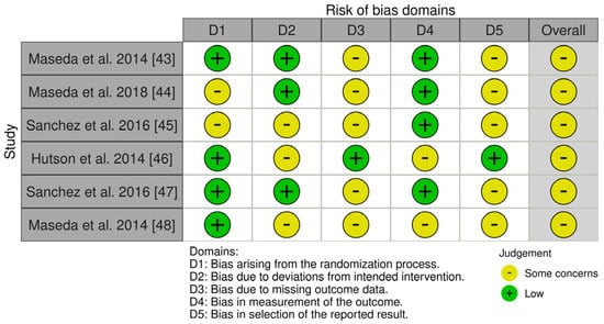 We assessed the risk of bias using appropriate tools based on the design of the included studies [43,44,45,46,47,48,49,50,51,52,53,54,55,56]. Of the fourteen studies, six were a randomized controlled trial (RCT) [43,44,45,46,47,48]. For this one, we used the updated Cochrane Risk of Bias (RoB 2) tool, which covers five domains: (i) bias arising from the randomization process, (ii) bias due to deviations from the intended intervention, (iii) bias due to missing data on the results, (iv) bias in the measurement of the outcome, and (v) bias in the selection of the reported result (Figure 2) [57].