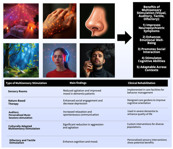 The research on MSS in dementia suggests a promising link between these interventions and neuroplasticity, the brain’s capacity to reorganize itself by forming new neural connections. Although dementia progressively impairs this capacity, evidence indicates that residual plasticity can be leveraged to mitigate cognitive and functional decline [71,72,73]. MSS, by simultaneously engaging multiple sensory modalities, can create a rich and stimulating environment that promotes neural activity and connectivity. This multisensory input may trigger several neuroplastic mechanisms. Firstly, it can strengthen existing neural pathways by increasing synaptic transmission and efficiency. Repeated activation of specific neural circuits through targeted sensory stimulation can enhance their functionality and resilience against further neurodegeneration [74]. Secondly, MSS can facilitate the formation of new neural connections, or neurogenesis, particularly in brain regions associated with learning, memory, and sensory processing. By providing diverse sensory experiences, MSS may stimulate the release of neurotrophic factors, such as brain-derived neurotrophic factor (BDNF), which support neuronal survival, growth, and differentiation [75]. Thirdly, MSS can enhance functional connectivity between different brain regions. By integrating information from various sensory modalities, the brain is forced to coordinate activity across multiple neural networks, strengthening their connections and improving overall brain efficiency. This enhanced connectivity can be particularly beneficial for complex cognitive functions that rely on the interplay of multiple brain areas. Furthermore, the positive emotional and behavioral effects of MSS, such as reduced agitation and improved mood, can indirectly support neuroplasticity. By reducing stress and creating a more positive emotional state, MSS can create a more conducive environment for learning and neural reorganization. In practical terms, this suggests that implementing well-designed MSS programs can potentially slow down the progression of cognitive and functional decline in dementia by maximizing residual neuroplasticity. By providing personalized and engaging sensory experiences, clinicians can create opportunities for the brain to reorganize and adapt, leading to more effective rehabilitation outcomes and improved quality of life for individuals with dementia. Further research is needed to fully understand the specific mechanisms by which MSS influences neuroplasticity in dementia and to determine the optimal parameters for maximizing its therapeutic benefits. Table 3 showcases the benefits and descriptions of different MSS related to dementia conditions.