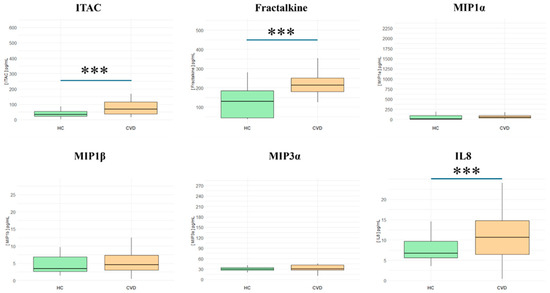 | ITAC (CXCL11) | Increased | Attracts activated T cells and macrophages, involved in Th1 response | Promotes immune cell recruitment to vascular lesions, potentially accelerating CVD progression | [58,59,60,61,62,63,64] |
