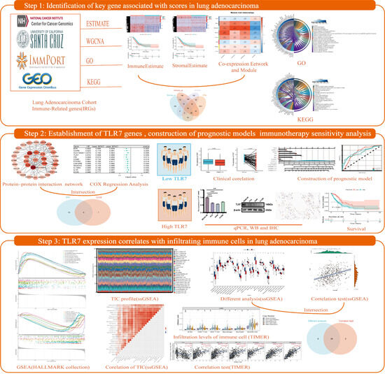 The following supporting information can be downloaded at: https://www.mdpi.com/article/10.3390/biomedicines13010151/s1, Supplementary file S1—Figure S1: Correlation of scores with survival and clinicopathologic staging characteristics of LUAD patients; Figure S2: Correlation of TLR7 expression with survival and clinical characteristics; Figure S3: Differential analysis of TLR7 expression correlating with tumor-infiltrating immune cells (TIC); Figure S4: TLR7 expression correlates with immune cells infiltrated in LUAD. Supplementary file S2—Table S1: Enriched gene sets; Table S2: Primer sequence; Table S3: Primary and secondary antibodies and dilution ratio.