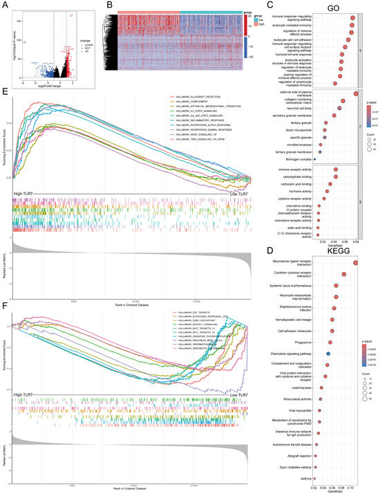 GO, KEGG, and GSEA of high- and low-expressing TLR7 groups in LUAD. (A) Volcano plots of DEGs generated by comparing TLR7 groups in LUAD. (|log2FoldChange| > 1 and Adjust p-value < 0.05). (B) Heatmap of TLR7 high- and low-expression differential genes. The row names of the heatmaps are gene names and the column names are the IDs of samples not shown in the graphs. (C,D) Differential genes were analyzed for GO and KEGG enrichment, and terms with p-adjust < 0.05 were considered significantly enriched. (E) The high-expressing TLR7 samples were enriched in the gene set of the HALLMARK collection and only the gene sets with NOM p < 0.05 and FDR q < 0.05 were regarded as significant. (F) Low TLR7 samples showed enrichment in HALLMARK sets.