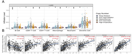 We utilized the single-sample gene set enrichment analysis (ssGSEA) approach within the GSVA R package (version 1.50.1) and the Tumor Immune Estimation Resource (TIMER) (http://timer.cistrome.org/) (accessed on 23 May 2024) to assess immune cell infiltration in lung adenocarcinoma. This research focused on the impact of TLR7 expression on the infiltration of immune cells, leveraging gene expression data. To explore the relationship between TLR7 expression levels and the presence of tumor-infiltrating immune cells, statistical significance was determined using both the Wilcoxon rank sum test and the Spearman rank correlation test for p-value calculation.