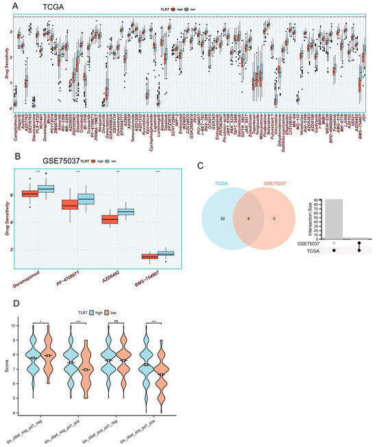 Drug sensitivity and immunotherapy analysis for high and low TLR7 expression. (A,B) Drug sensitivity analysis of LUAD patients in TCGA and GSE75037. (C) Venn analysis of drugs common to (A,B). (D) IPS analysis of LUAD patients in TCGA. (***: p < 0.001, *: p < 0.05, ns: not significant).