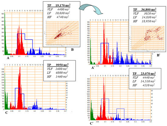 An example of heart rate variability (HRV) monitoring in an elite athlete before and after the two-week supplementation with oil derived from the seeds of Amaranthus cruentus. The presentation of the spectrogram (A) and scatter plot (B) in a supine position, and the spectrogram in an orthostatic position (C) before and after (correspondingly (A’–C’) supplementation. A significant increase in TP due to activation of the autonomic nervous system (LF and, especially, HF) is associated with the reduction (optimization) of central regulatory influences (decrease in VLF) in a supine position. Note also an “expansion of regulatory area” located around 0.15–0.2 Hz at the scatter plot A’, which may be seen as a sign of developing a hormetic response that is also linked to mechanisms of anti-aging (adapted from [80]). Note: HF—high frequency (blue color on the spectrogram); LF—low frequency (red color on the spectrogram); TP—total power; VLF—very low frequency (green color on the spectrogram). Spectrogram on the x-axis: top—breathing rate, 1/min; bottom—frequency, Hz; on the y-axis: left—amplitude, ms2/Hz × 1000; right—number of breathing cycles.