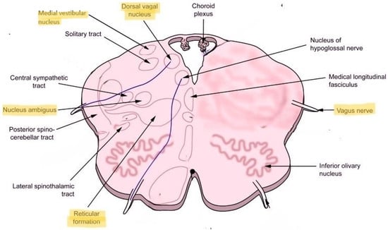 Dorsolateral inferior medulla as a possible localization for Long COVID, post-COVID dysautonomia and POTS, in general, is a reasonable consideration from the standpoint of clinical–anatomical correlation [6,12,13]. First, the reticular formation serves as a relay between the peripheral and central nervous system in how the brainstem controls cardiopulmonary functions, respiration and consciousness. The reticular formation is vital to numerous critical functions, including arousal, consciousness, circadian rhythm, sleep–wake cycles, coordination of somatic motor movements, cardiovascular and respiratory control, pain modulation and habituation [15]. The vasomotor center present in the medulla modulates cardiovascular control. The central areas, located caudally in the reticular formation at the pontomedullary junction, play a role in the autonomic rhythms of respiration. These central areas are also connected to the cranial nerve motor nuclei of the trigeminal, facial, glossopharyngeal, vagus and hypoglossal nerves to result in the coordinated function of respiration [15].