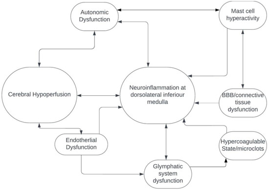 Cerebral hypoperfusion is one of the major mechanisms of POTS, autonomic dysfunction, myalgic encephalomyelitis/chronic fatigue syndrome and probably Long COVID [6]. How cerebral—and, in particular, brainstem—hypoperfusion fits with neuroinflammation of the dorsolateral inferior medulla is currently unknown and needs to be investigated. It is possible that small penetrating arteries coming off the vertebrobasilar arterial system and supplying the brainstem may be damaged from endothelial dysfunction, hypercoagulable state and possible microclots, all of which appear to be important in the pathogenesis of Long COVID (Figure 2) [14]. Additionally, and/or alternatively, alterations in the glymphatic system may result in inadequate venous drainage of the dorsolateral medulla, venous congestion and toxin accumulation, further leading to neuroinflammation (Figure 2) [17]. Finally, abnormalities in the connective tissue itself, possibly resulting from neuroinflammatory and immune-mediated pathways that include hyperactivated mast cells, could alter the composition of venous and arteriolar walls and the blood–brain barrier, which could, in turn, result in abnormal vascular contractility and stiffening, thereby causing decreased perfusion of the brainstem (Figure 2) [14,17]. Importantly, further studies are needed to elucidate the interplay of these and other possible identified and unidentified mechanisms that can induce neuroinflammation of the brainstem, which, in turn, may lead to a wide range of diverse neurologic and non-neurologic symptoms and signs of post-acute infectious syndromes.