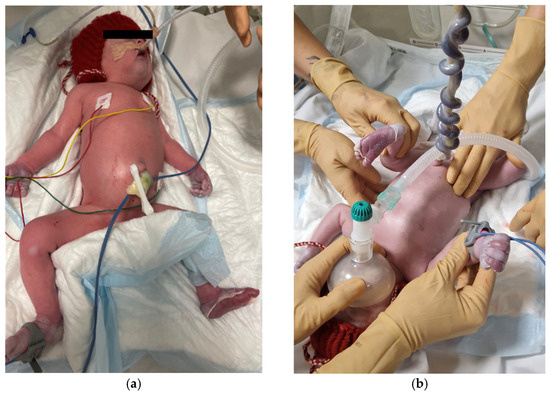 Condition of a newborn after the delivery. (a) Abdomen is enlarged due to hepatosplenomegaly. (b) Peeled skin of palms and soles is visible.