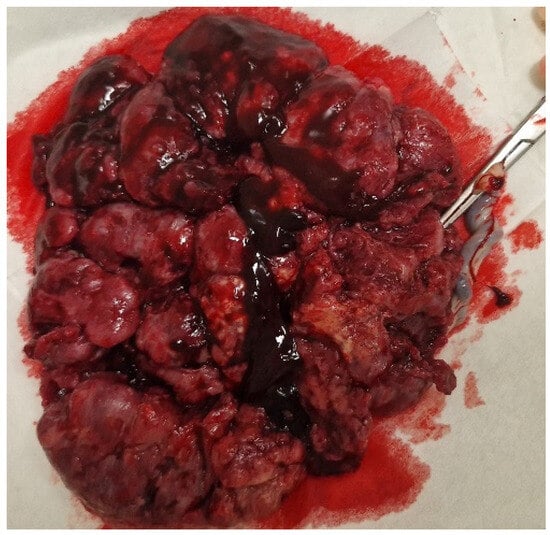 Macroscopic view of the placenta with visible hemorrhages.
