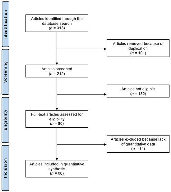 A systematic literature search identified a total of 313 clinical trials that addressed the topic of interest. Of them, 101 studies were identified as duplicates and excluded. The abstracts of the remaining 212 investigations were screened for eligibility. An additional 132 studies were not eligible. In detail, the reasons for exclusion were inappropriate study type and design (N = 48), low level of evidence (N = 21), not clearly stating the molecular weight of the HA for injection (N = 13), evaluating intra-articular HA injections augmented with other biologically active compounds (N = 19), considering other non-infiltrative therapies as comparators (N = 16), missing implementation of the VAS (N = 10), and language limitations (N = 5). In total, 14 more studies did not include quantitative data on the endpoints of interest and were therefore not considered. This left 66 RCTs for final inclusion. The results of the literature search are shown in Figure 1.