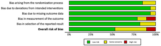 The revised Cochrane risk of bias assessment tool (RoB2) was applied to investigate the risk of bias in all investigations included in the present review, as they were RCTs. The assessment identified some concerns during the randomisation process. However, given the established comparability of the groups studied at baseline, bias arising from the randomisation process was rated as predominantly low-risk. Risk of bias based on the deviations from the intended intervention, missing outcome data, the selection of the reported outcome, and the measurement of the outcome were occasionally noted with some concerns, leading to a low to moderate overall risk of bias in these domains. Given the lack of investigators blinding, some of the articles found a high risk of bias in outcome measurement; in all other studies, a low to medium risk was found for this area. In conclusion, the risk of bias graph evidenced a predominately good quality of the methodological assessment of the RCTs (Figure 2).