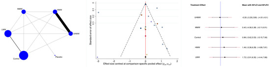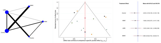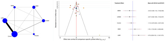 The main author (F.M.) performed the statistical analyses following the recommendations of the Cochrane Handbook for Systematic Reviews of Interventions [36]. IBM SPSS software version 25 (International Business Machines Corporation, Armonk, NY, USA) was used for descriptive statistics. Variance analysis (ANOVA) was used, and p-values > 0.1 were considered satisfactory. The analyses were divided into four time points: from two weeks to one month, one month to two months, two to four months, and four to six months. STATA Software/MP, Version 14.1 (StataCorporation, College Station, TX, USA), was used for the statistical analyses. Network analyses were performed through the STATA routine for Bayesian hierarchical random-effects model analysis. The Log Odd Ratio (LOR) effect measure was adopted to analyse dichotomic data. The overall inconsistency was evaluated through the equation for global linearity via the Wald test. If PWald > 0.5, the null hypothesis cannot be rejected, and the consistency assumption could be accepted at the overall level of each treatment. Both confidence (CI) and percentile (PrI) intervals were set at 95%. The control group was considered an active group, and the placebo was considered a comparator for the analyses. Edge plots were drawn to assess the contribution of each intervention, statistical weights, and direct comparisons. Interval plots were drawn to rank the interventions according to their effect size. A funnel plot was also drawn to assess the publication bias. Greater pyramidal symmetry in the funnel plot is associated with lower data heterogeneity.