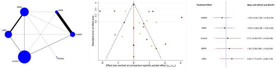 The MMW and UHMW groups were associated with greater VAS reduction, while the LMW group was associated with a lower reduction (Figure 3). The PWald indicated no evidence of statistically significant inconsistency in the analyses (PWald = 0.2).